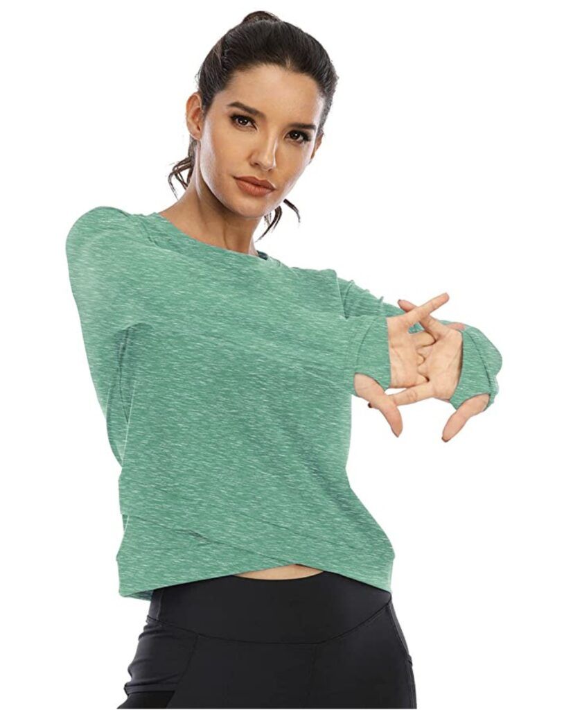I know there’s a contingent of people who work out who still prefer lighter, looser-fighting clothing. This long-sleeved crop top shows just the faintest hint of skin while still things movable and free. Thumbholes (there they are again!) keep your sleeves down and the fabric dries quickly and is nice and stretchy. I love the crossover hem, which adds visual interest to the hem.