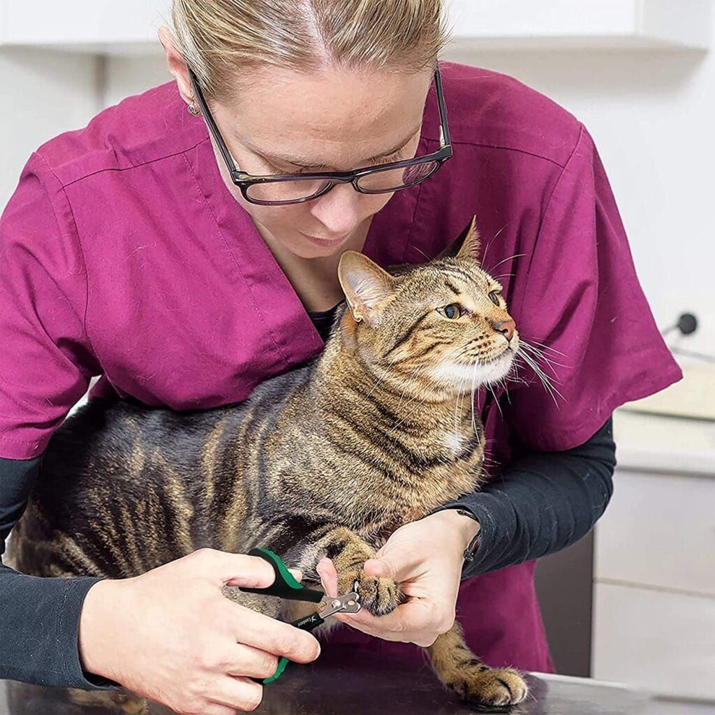 A good pair of claw trimmers makes a world of difference. These give you a superior grip so you don’t have to fuss as much while your cat is squirming away. You can clip super fast and you’re guaranteed a clean cut. I love it and my cat tolerates it (which is all I can ask for).