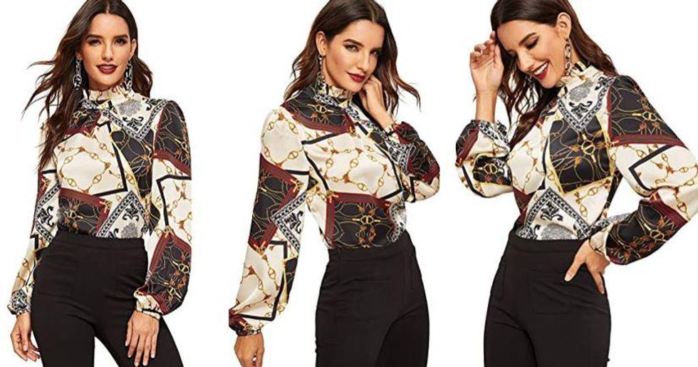 If you’re looking for an elegant blouse, then printed fabrics are the way to go and this one is my go-to. The high neck flatters the décolletage and the puffed sleeves give an old-fashioned elegant flair.