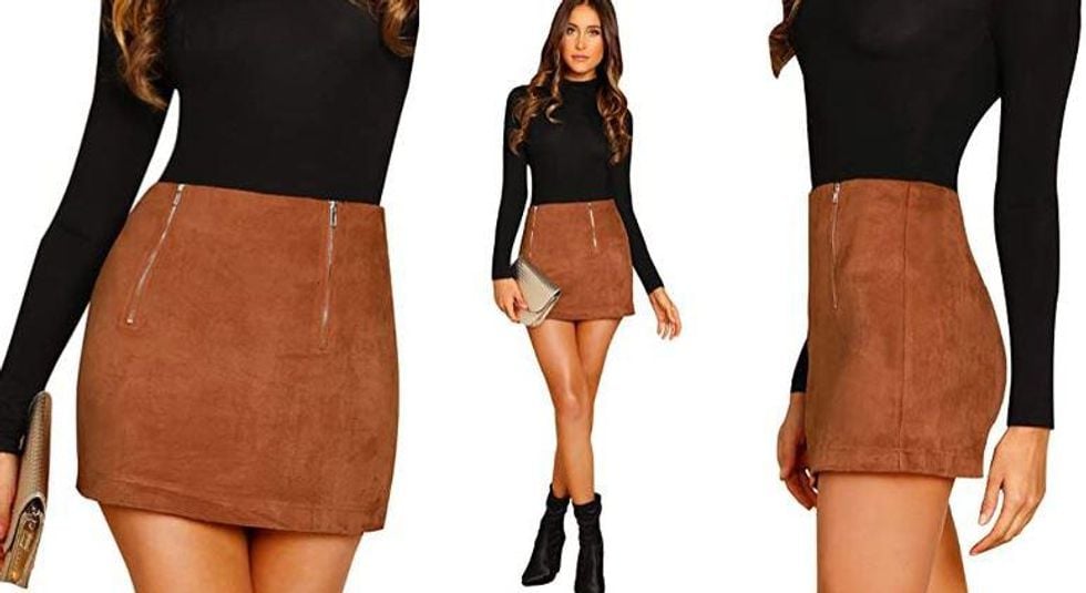 Whether it’s spring, fall or winter, this faux suede bodycon mini will be an elegant skirt that transcends the seasons. The two zips at the front add a bit of detailing for style and the high waist is flattering on the figure.