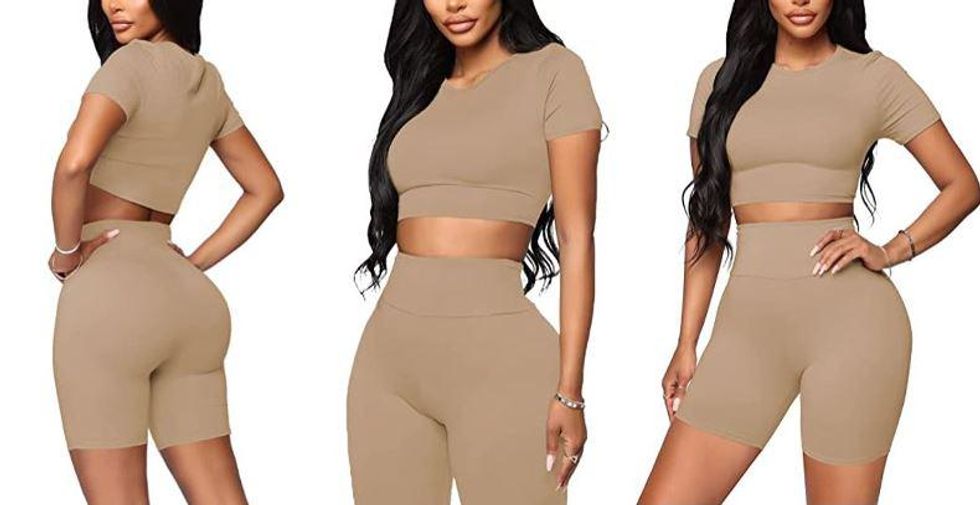The two-piece set has loads of colors to choose from, from khaki to black, to red. The stretchy fabric has a compression feel that is flattering on the figure despite being skin-tight. So, all you need is to slip this on and start your workout.