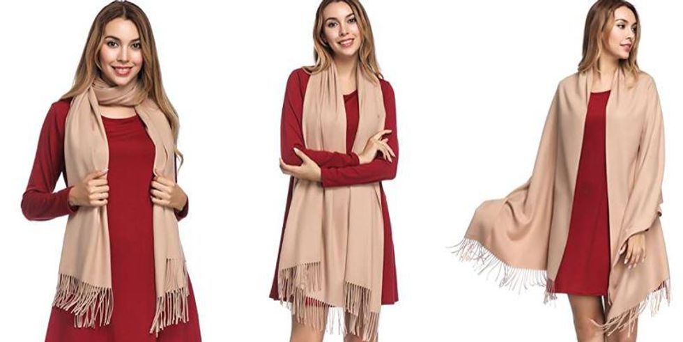 I’ve always loved an old-fashioned Pashmina shawl because they’re so versatile for casual and elegant occasions. This camel wrap is silky soft and medium weight, so it’s great for in-between seasons as well as winter.