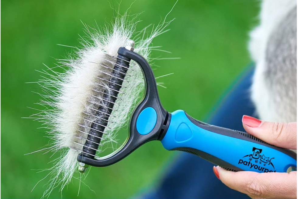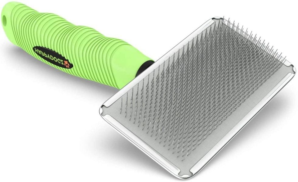 Our labradoodle puppy’s hair grows so fast I feel like she gets haircuts more often than I do, but in between grooming sessions we use this pet brush to de-mat and smooth out her fur. This brush acts as both an undercoat rake and de-shedding tool for both single and double-coated dogs and cats and comes in two sizes, small and medium/large depending on what breed you have. The bristles are long and soft so they do a great job of combing and detangling without irritating your pet’s skin.
