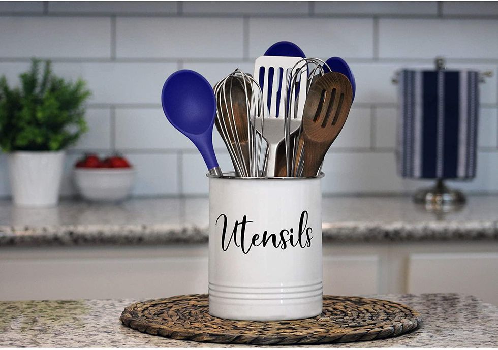 If you don’t have drawers in your kitchen or you just like having your cooking tools at your fingertips, this utensils crock is a stylish way to stay organized! It’ll hold all your essentials and then some, like spatulas, ladles, long spoons, whisks, and more. Plus, the design is so cute and classy, it’d look great with so many types of kitchen decor.