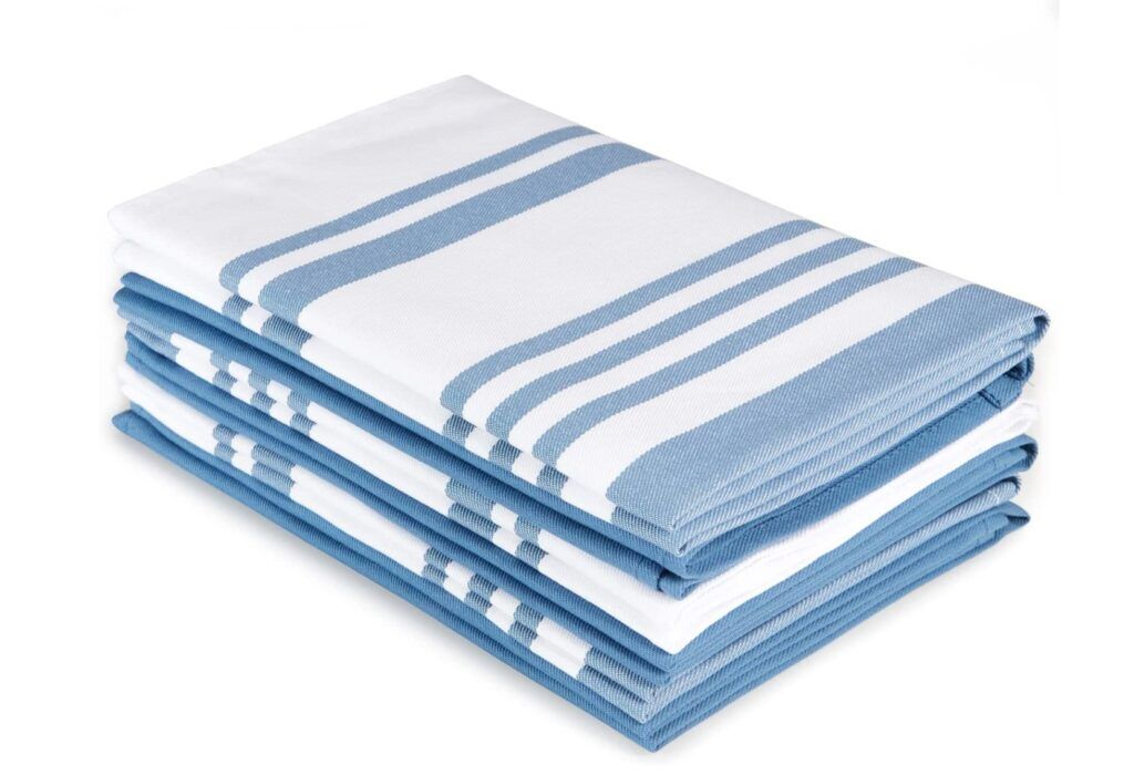 Amateur home cooks and bakers know the benefits of having lots of spare dish towels around the house. This pack of 6 features a classic denim blue and white striped design that will brighten up any countertops. You’ll save on disposable paper towels as these are machine washable and durable enough to clean up any spill.