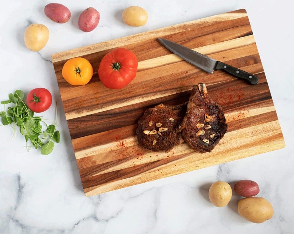 Take a look at what reviewers think of this acacia wood cutting board: “It is a stylish and sturdy piece, that comes with care instructions so I can easily maintain its gorgeous finish. I am using this board in more ways that I had planned… for food prep when making fresh pasta, but also as a board for serving because it is so pretty used as centerpiece.”