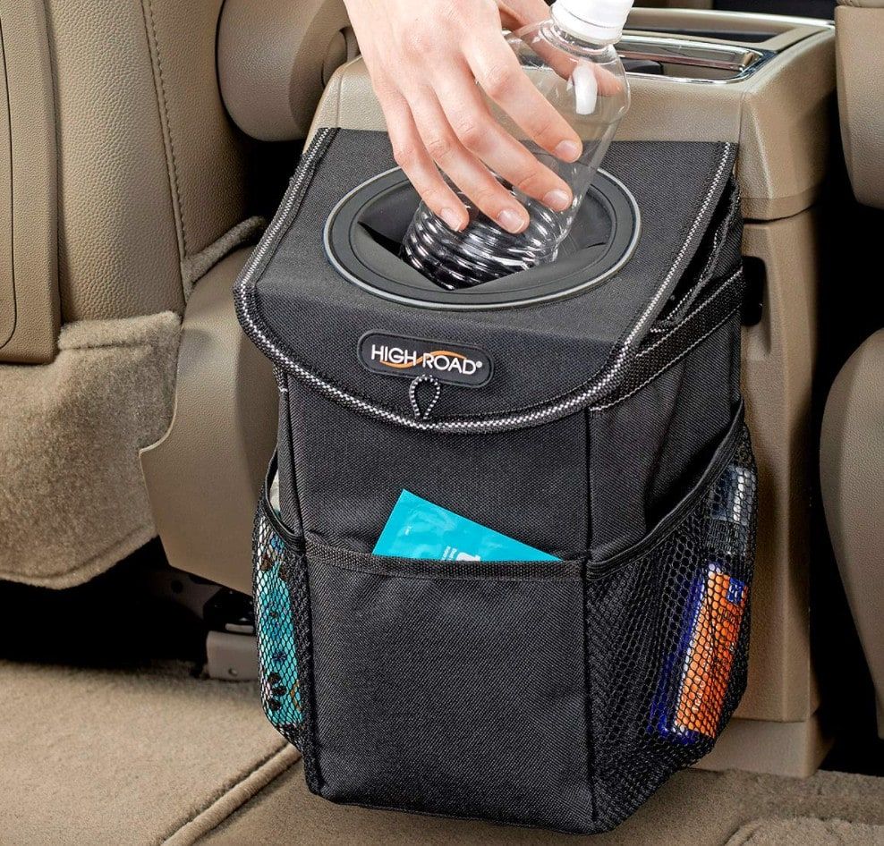 Check out this review of this car trash can: “The flexible opening is genius – perfect size for cans, bottles and any other waste. I love that the lid can be securely closed with hook & loop and I also like the little added benefit of the storage pockets on all sides.”