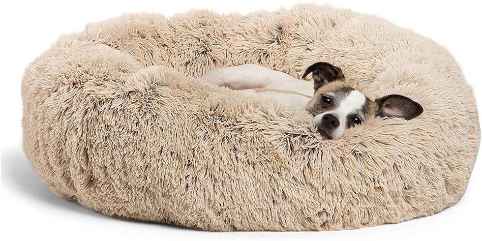 I don’t know about you, but I hope one day I’ll look as comfortable as this guy does lying in this calming donut pet bed. Made of vegan faux shag fur, it is luxuriously soft and its round design with a raised rim offers both head and neck support as well as a sense of security. This bed comes in various sizes and colors and all are completely machine washable.