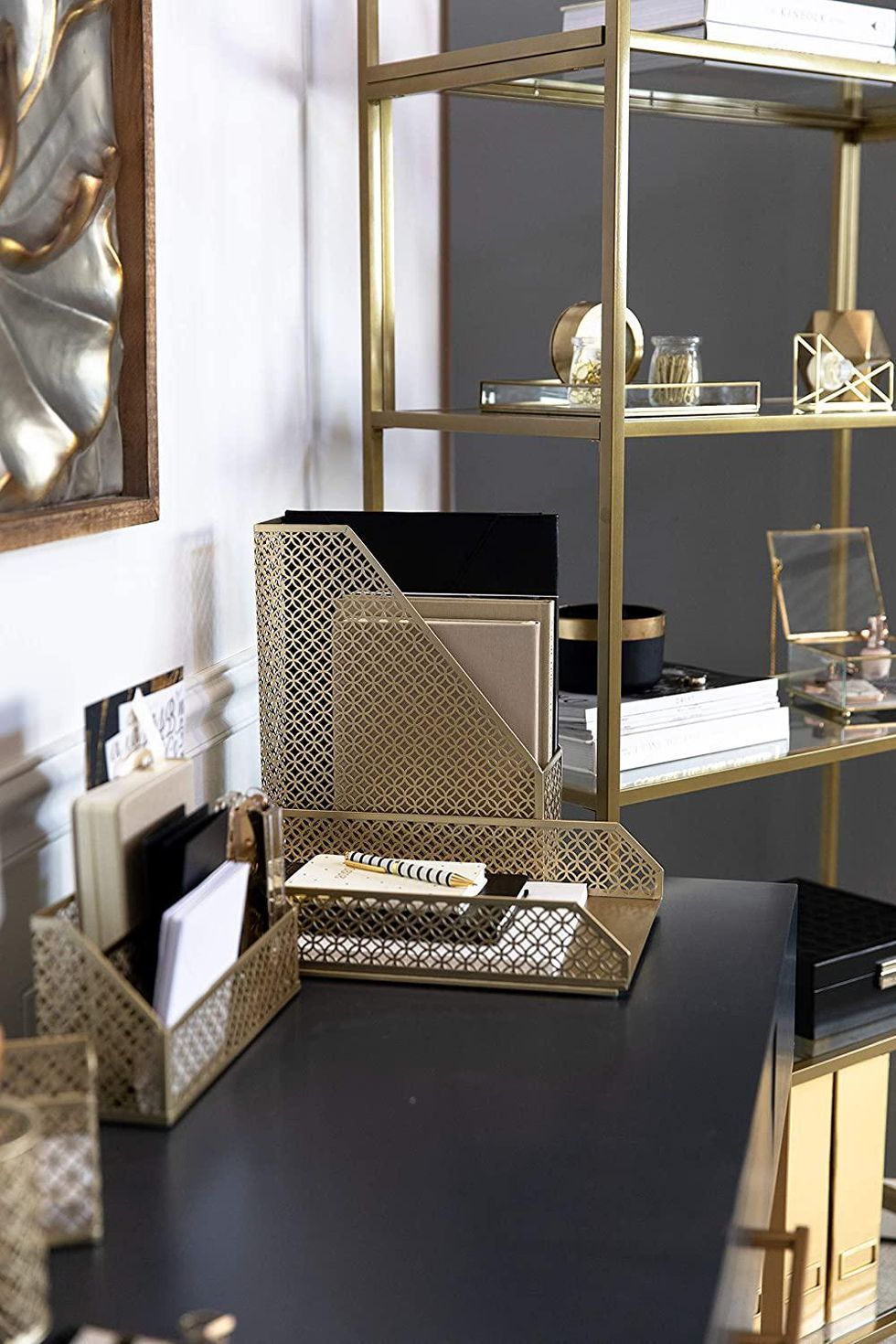 Add your own pizzazz to your desktop with a six-piece desk organizer set in gold, black, rose gold, white, or one of several other fashion colors. Included with the set is a letter tray, magazine rack, business card holder, sticky note organizer, pencil cup, and supply rack. Not only can you stay organized, but you can look especially good doing it.