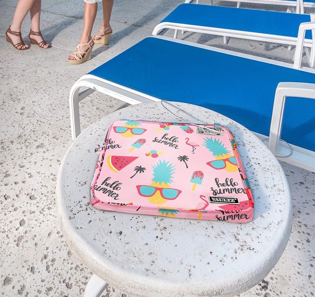If you don’t look chic at the pool, are you even trying? This water-resistant combination lock pouch protects your valuables when you’re at the pool, hanging at the beach, or climbing aboard a boat. The tether is great for attaching to a chair or table to ensure nobody makes off with your stuff. Grab it in the “Hello Summer” print pictured or a juicy watermelon print.