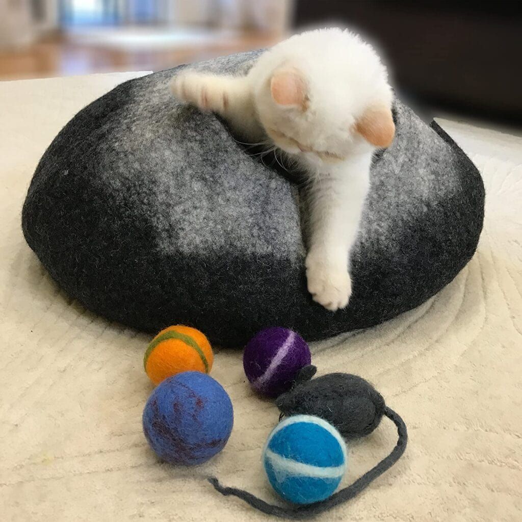 Cats will chill literally anywhere, from empty boxes to window sills. This cat cave won’t stop them from “If he fits, he sits,” but they’ll enjoy it nonetheless. It’s handmade shaped felt that makes a cozy indoor hideaway for your feline friends. It also comes in more than a dozen colors so that weird cave-shaped thing in your living room will blend right in.