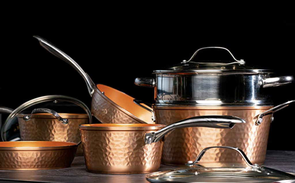 This set of copperware pans includes saucepans and frying pans of varying sizes, as well as a gorgeous, stainless-steel steamer basket that you can dual-use to pre-wash the veggies in. I really like the contrasting silver handles to the hammered finish of the copper and lid designs, as well.