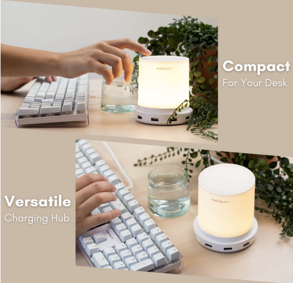 Add a soft glow to your bedroom or desk with this Bedside Touch Lamp. Featuring a warm white LED light, the lamp operates by touch to turn on and off and toggle between the brightness settings. The base of the lamp provides four handy USB ports.