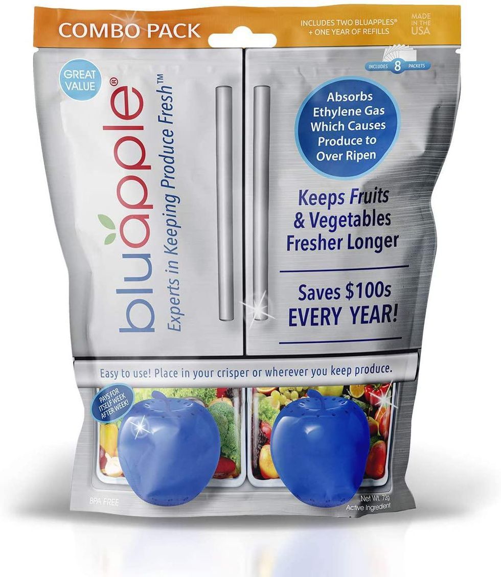 As part of my kitchen clean-up, I added these little blue apples to those produce bins I showed you earlier. Now my greens last for way longer — which means I can still order $30 pad thai twice a week, but without having to feel guilty about all my spinach wilting. Each one will even work for up to three months, and each order comes with refills!