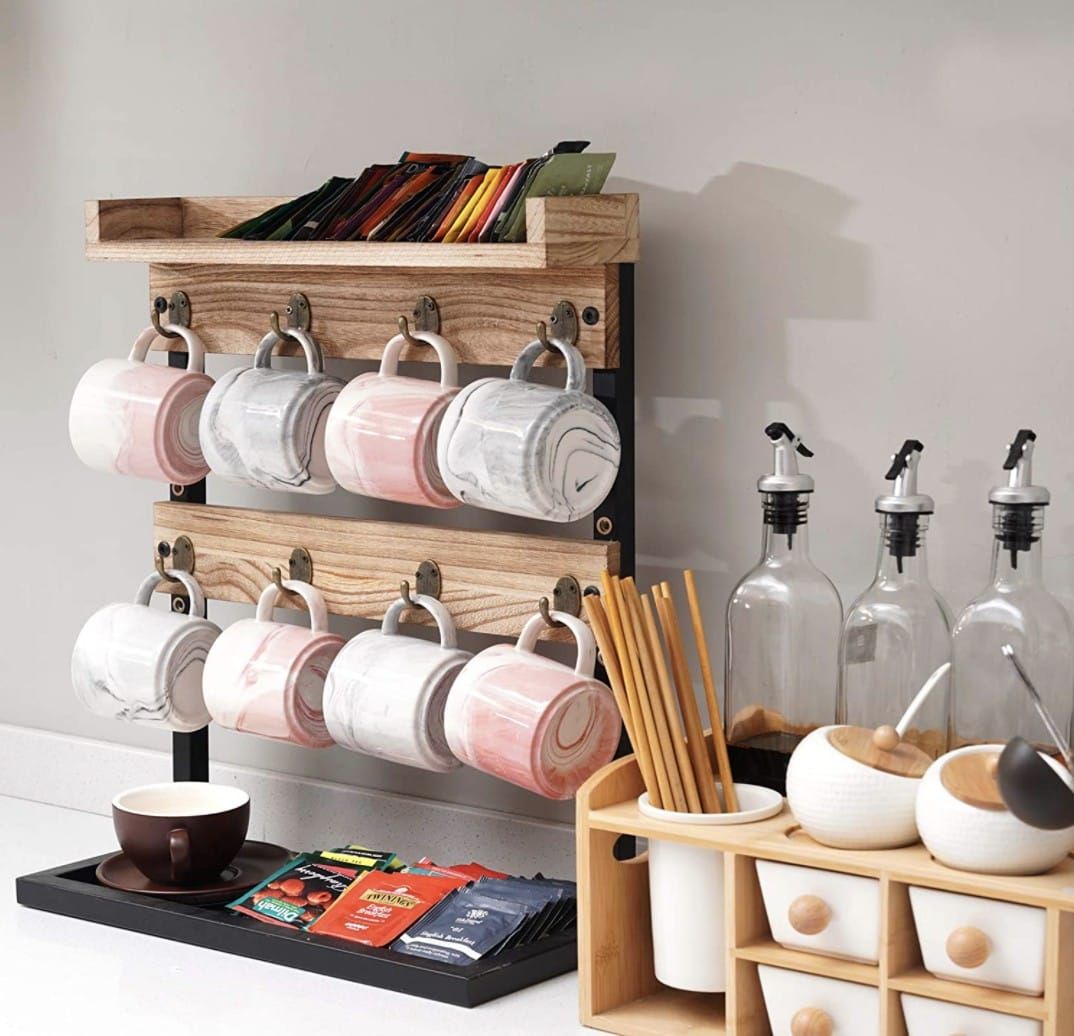 This mug holder is both modern and farmhouse-style and I adore it. It takes up very little space but holds up to eight mugs plus tea bags, a sugar bowl, and any other coffee or tea accessories you like! You can use it on the countertop or wall mount it, and the second rack is height-adjustable.