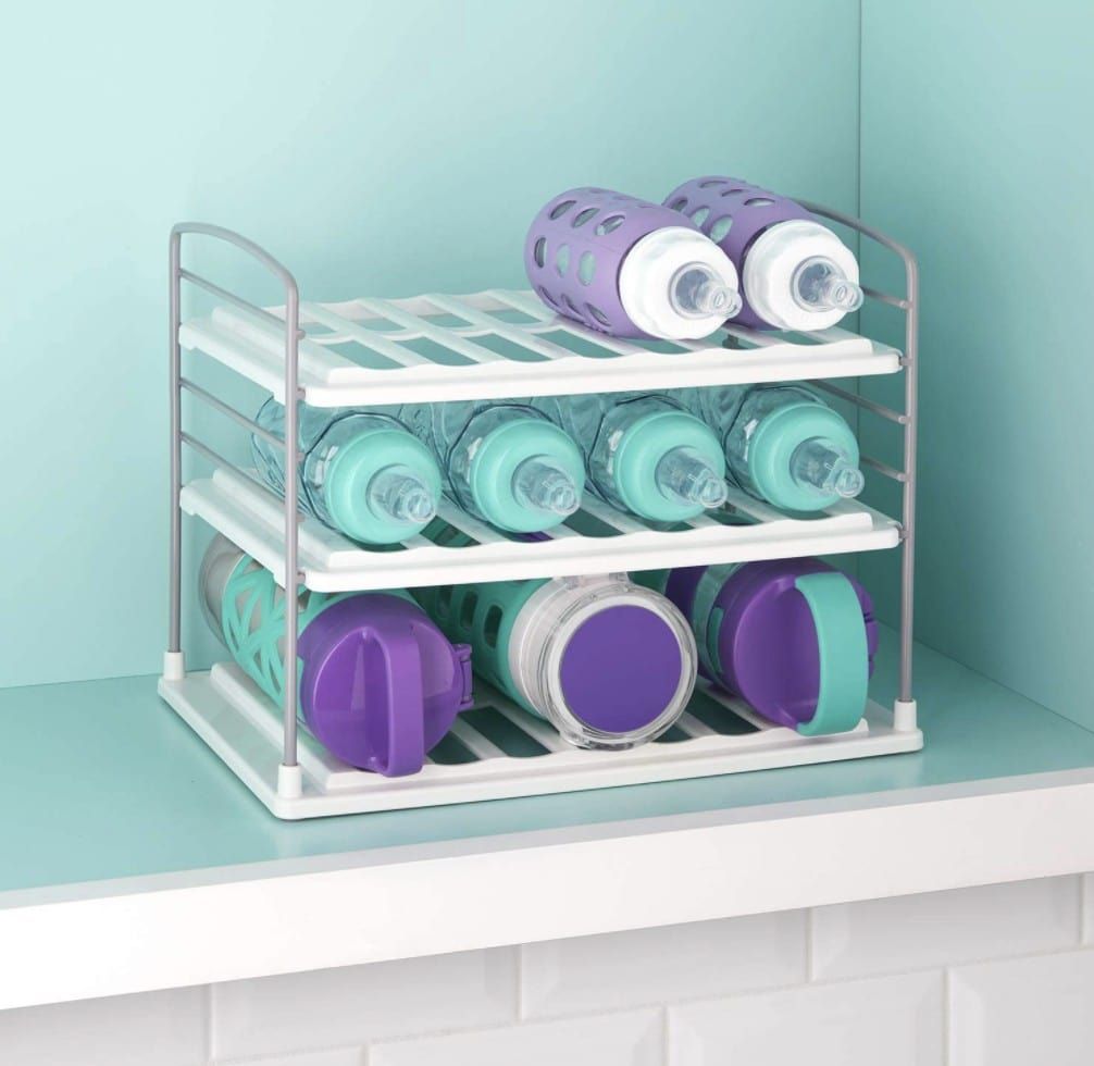 Water bottles are the bane of my existence, it seems like they multiply overnight when nobody’s looking! It’s especially annoying when I’m trying to find one and all of them topple over like bowling pins. I keep them in order with this three-shelf water bottle holder that stores up to nine bottles.