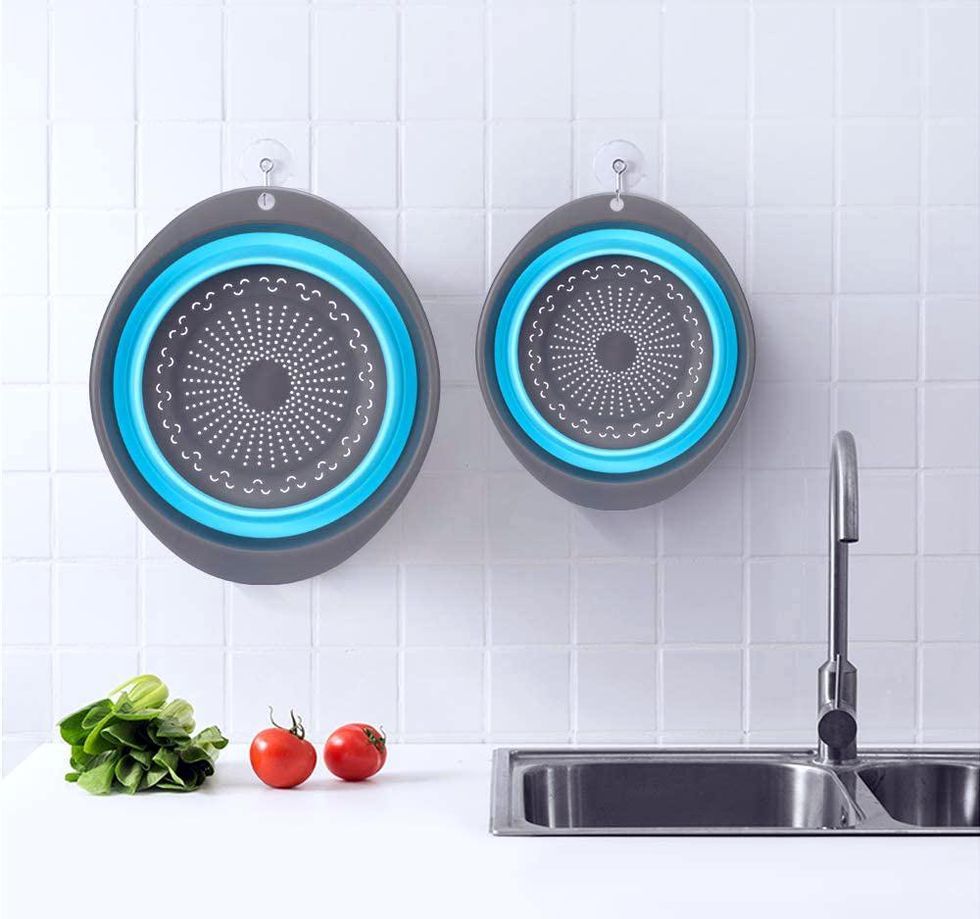 Save Space in the Kitchen With This Collapsible Set of Two Silicone Strainers, in Red or Blue