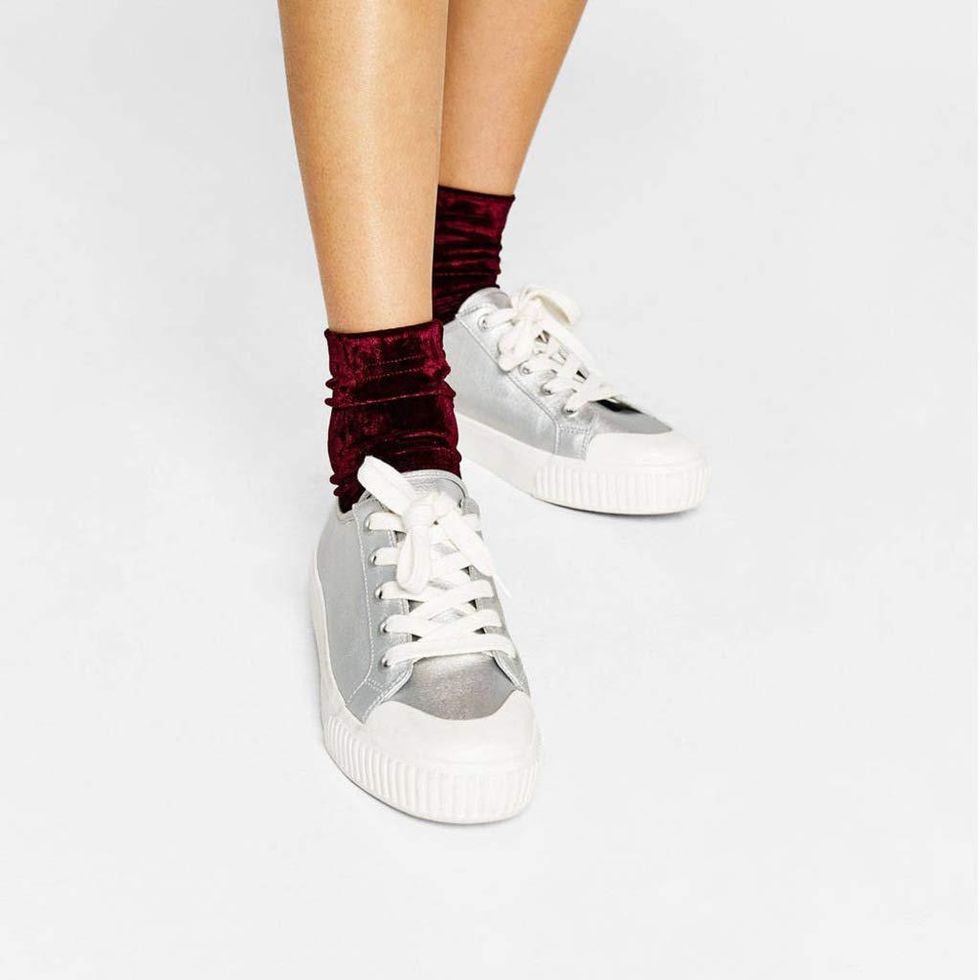 Picture this–a skater dress, a denim jacket, these velvet socks, and a pair of white sneakers. That’s a damn cute outfit if you ask me. Although if it doesn’t sound like the right fit for you, these would also be super cute paired with chunky clogs or heels for a feminine yet bold look.