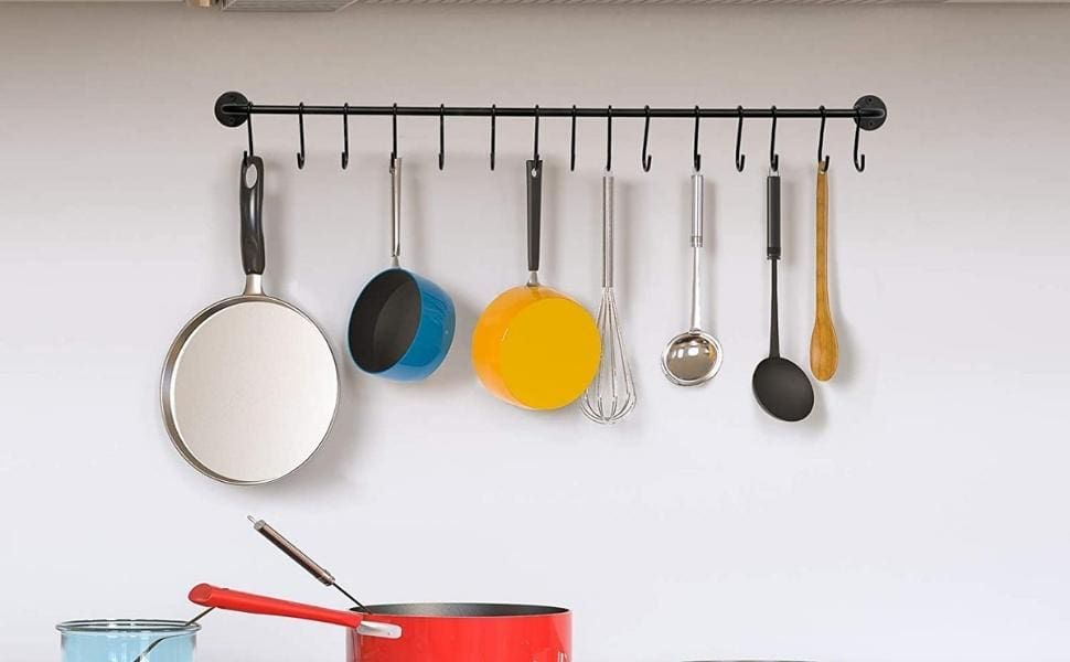 Pots and pans look better hanging when not in use. This 15-hook rail is a great addition to your kitchen with a combination of functionality and looks. Yes, your pans, pots, and key utensils will be within reach, but it will also improve the look of your kitchen wall.
