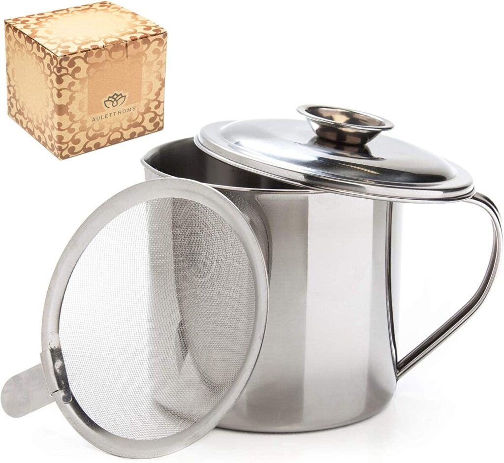 If you’re on a healthy keto or paleo diet and enjoy using bacon grease in your meals, you need the Aulett Home bacon grease container that’s equipped with a strainer. This container can store up to 5 cups of bacon grease and is ergonomically designed to prevent your hand from getting burned. I love it!