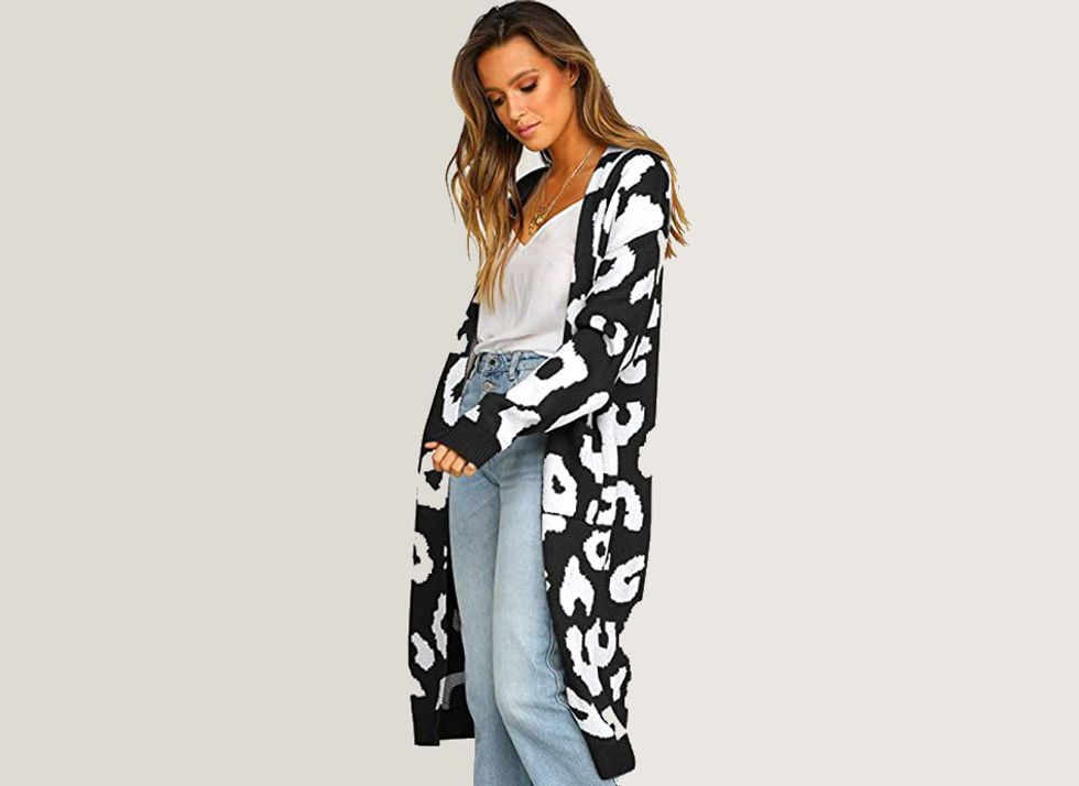 Get in on this fall’s animal print trend with this oversized open-front cardigan.
