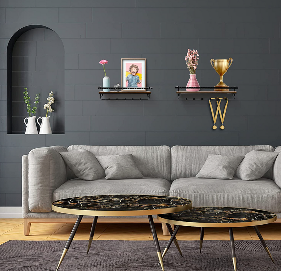 This set of two shelves is incredibly cool because you can tailor it to your exact needs. Sure it has dedicated space for 23 pairs of earrings, but the pegs and the shelves themselves are open for any organizational needs. You can use it for more jewelry, or you could hang hats and belts and use the shelves for pictures.