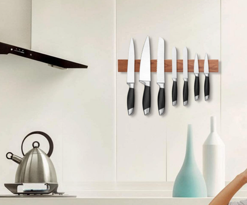 Don’t have enough counter space for a bulky knife block? This magnetic strip lets you hang your blades up on a wall — and unlike other magnetic “blocks,” this one is made from solid teak wood. It won’t rust, dull, or chip over time, and it’s magnetic enough to hold larger utensils besides knives.
