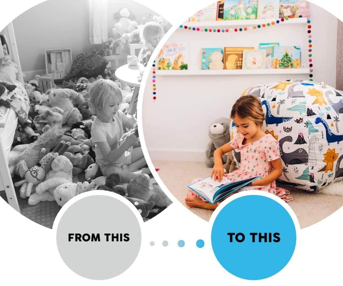 You know how difficult it can be to keep their stuffed toys wrangled if you’ve got kids. Every day it seems like they keep multiplying. This fun beanbag is the perfect solution! It’s a stuff sack for stuffed toys and makes clean-up easy and fun! And it adds extra space for seating, and that’s a win all around.