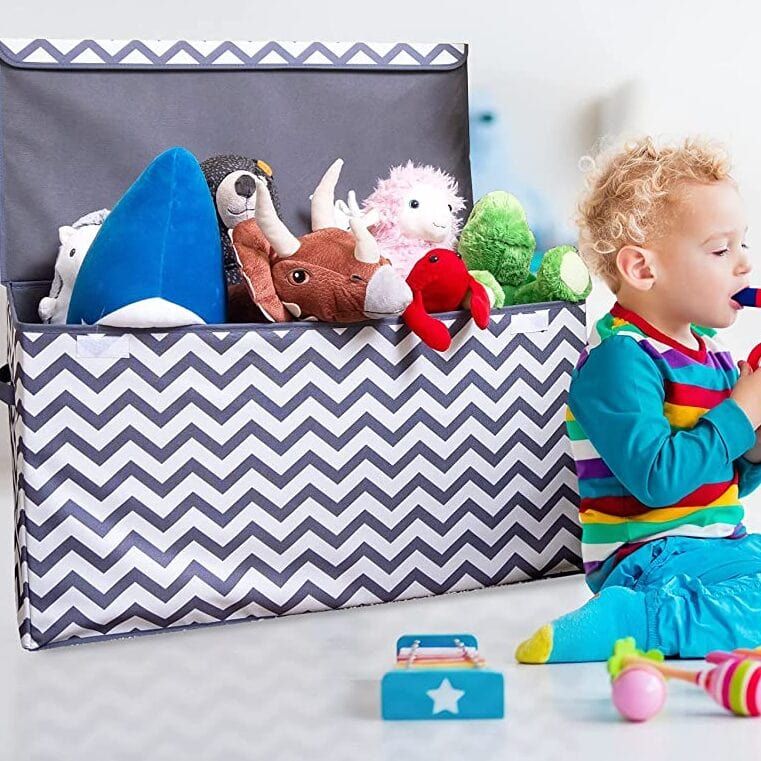 These storage bins are soft, so there are no hard corners for your kids to bump their noggins on. It’s got handles for easy moving, and it’s pretty sizeable to fit lots of princess toys and Tonka trucks during your nightly tidy-up.