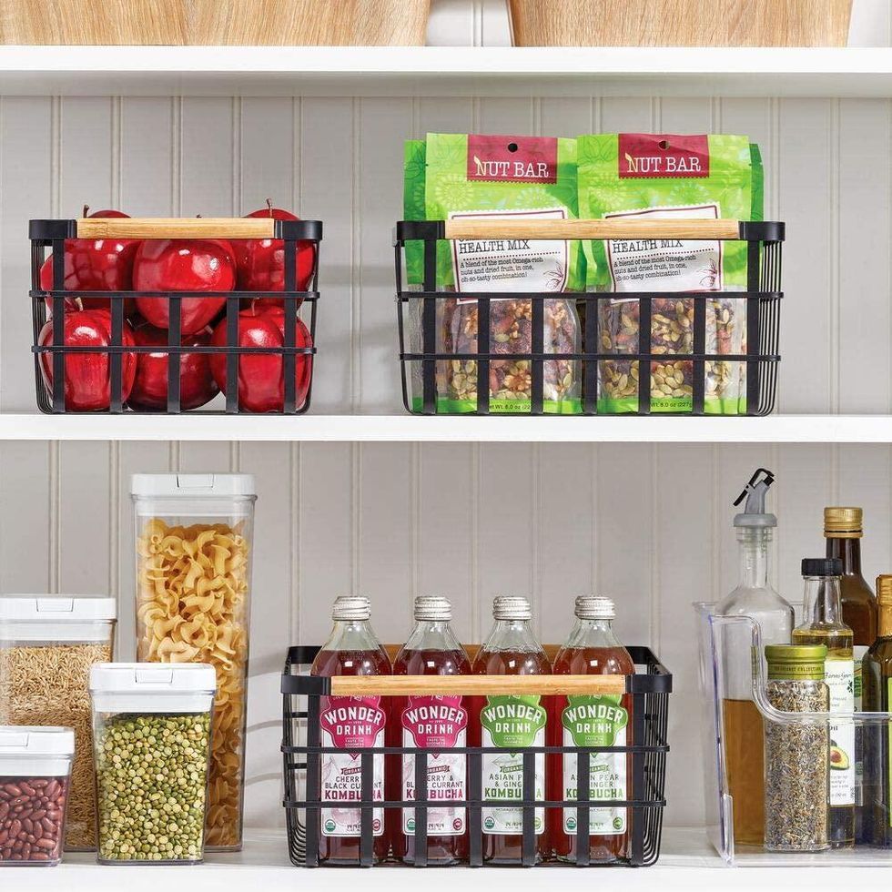 I use these wire baskets to organize snacks and pantry items in our pantry (closet), and I love the mix of sleek metal and warm bamboo handles. I love how I can see exactly what I’ve got in stock with a glance, which makes shopping much easier, and we waste less food since it’s clear what we need to use up before buying more. These are also less expensive than very similar versions I’ve seen, making me happy since this girl loves a bargain.
