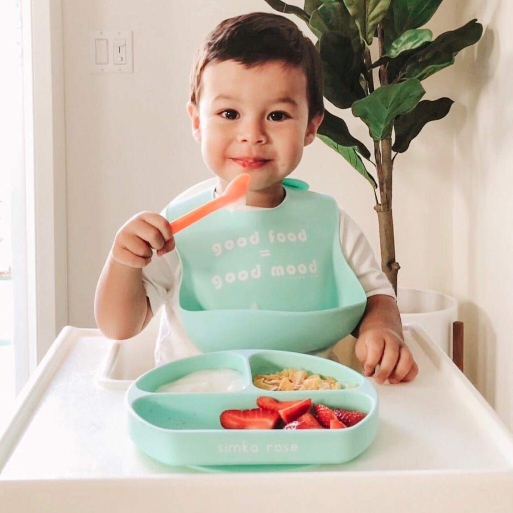 You got utensils added to your cart, which means you also need to add this plate too. It suctions to a high chair, so they can’t knock it onto the floor, and it has three different sections for parent-approved portions.
