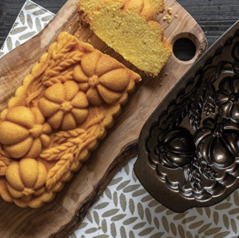It was love at first sight for me and this loaf pan. The mold is beautiful and creates a autumnal pattern to your bread or cake for the season. The reviews also agree with my sentiments, “So happy to add this to my Nordic Ware collection. Sturdy, great quality typical of Nordic Ware. If you know what you’re doing you’ll have no issues with cake releasing from this pan. If you’re a novice there are plenty of tips on-line. Perfect for pumpkin bread, corn bread, spice cakes.”