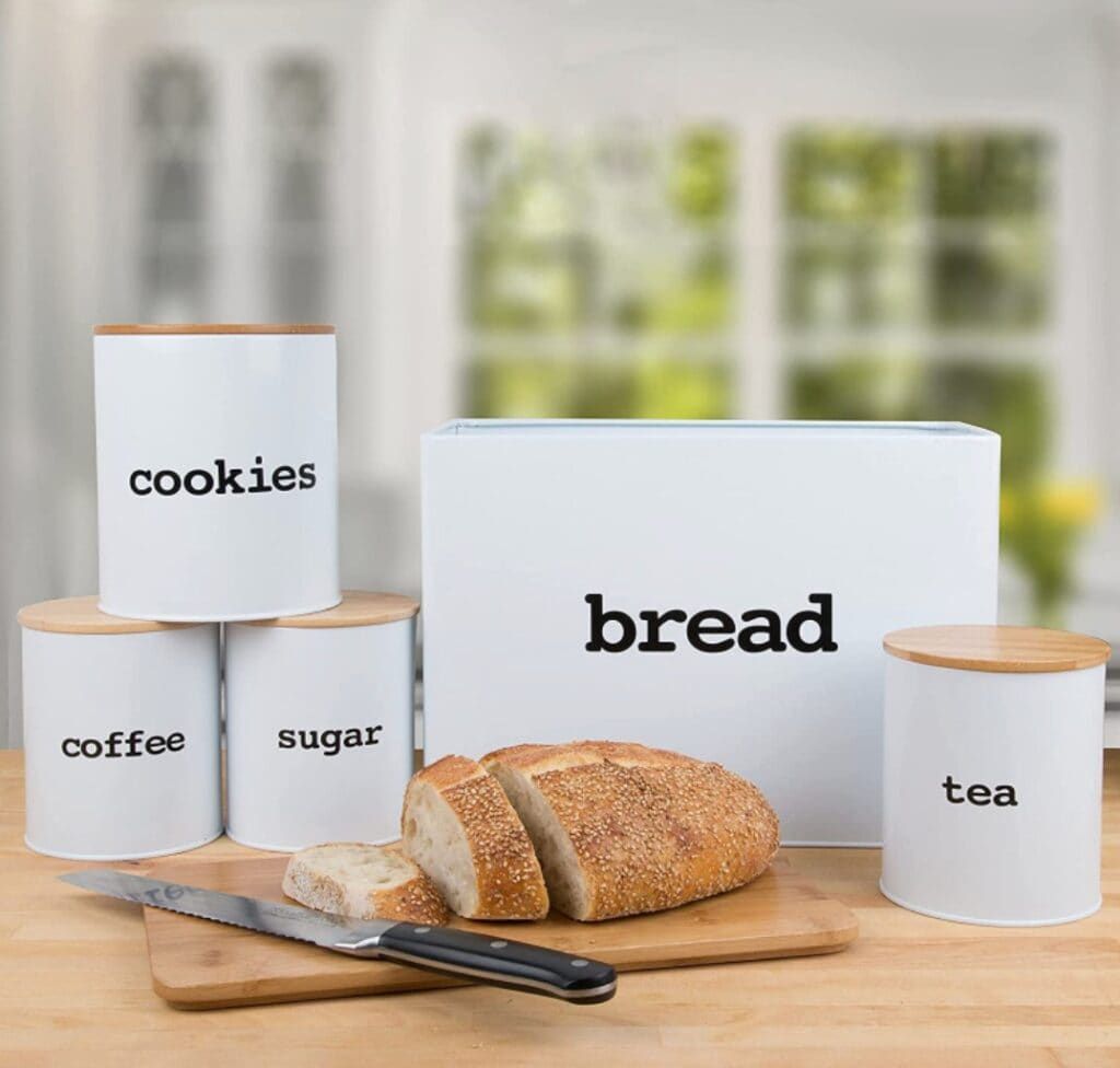 Give your kitchen a new lease of life when you pick up this 5-piece canister set. Including the regular coffee, tea and sugar containers with airtight lids, as well as a cookie jar and an extra-large bread box, this classic set will match any style of home.