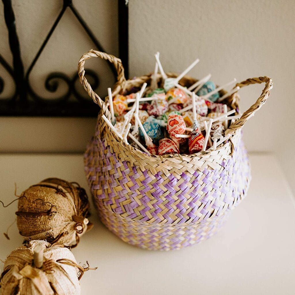 I like interesting bags, boxes and storage containers and this seagrass belly basket, though small, is an interesting addition to any table or bookcase. Use it to stash gum or mints on your desk at work or put a plant in it to dress up a bookshelf or bathroom vanity. This version is adorned with lavender color woven throughout for that extra touch.