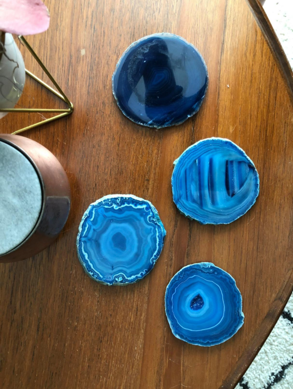 Geodes are so cool to look at. Naturally-occurring geodes are rocks that have cavities inside them, often lined with crystals. These coasters are natural polished geodes that have been dyed blue — no doubt a conversation starter, as well as a stylish addition to your living room. Also available in natural, pink, purple, or teal, you’ll receive a set of four that will protect your wood and add a touch of beauty.