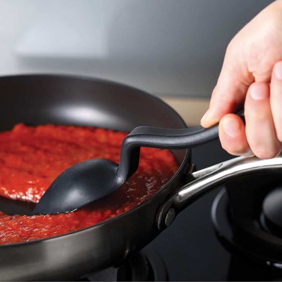 ​The makers of the Supoon claim it’s the world’s best cooking spoon, a claim so bold that I decided I had to try it. This silicone tool is sturdy at the tip but flexible on the sides. It includes measuring marks, so you can use it to add ingredients directly to the pan without dirtying another spoon. It also has a bent handle, so it sits up off the counter, making one less spot I have to clean. So, yeah, I agree it’s the world’s best cooking spoon, or at least the best one I’ve tried!