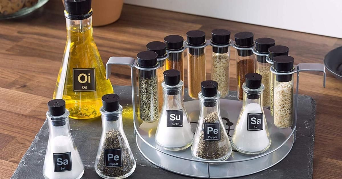 If you’ve seen one spice rack, you’ve seen them all, am I right? But, not so fast! This “spice rack” has the look of a chemist’s kit, complete with nine test tubes for spices; three flasks for sugar, salt, and pepper; an Erlenmeyer flask for oil; and, a carrying tray. Each flask features a rubber stopper stop and the entire thing comes with pre-printed labels in popular spice names you can add yourself.