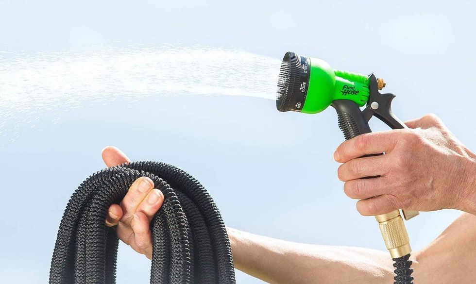 This is not your mother’s old garden hose! The Flexi Hose is designed to be lightweight, flexible, and easy to maneuver. It resists kinking and knotting, and when water flows through it, the hose expands to three times its dry length. The hose includes an 8-function nozzle.