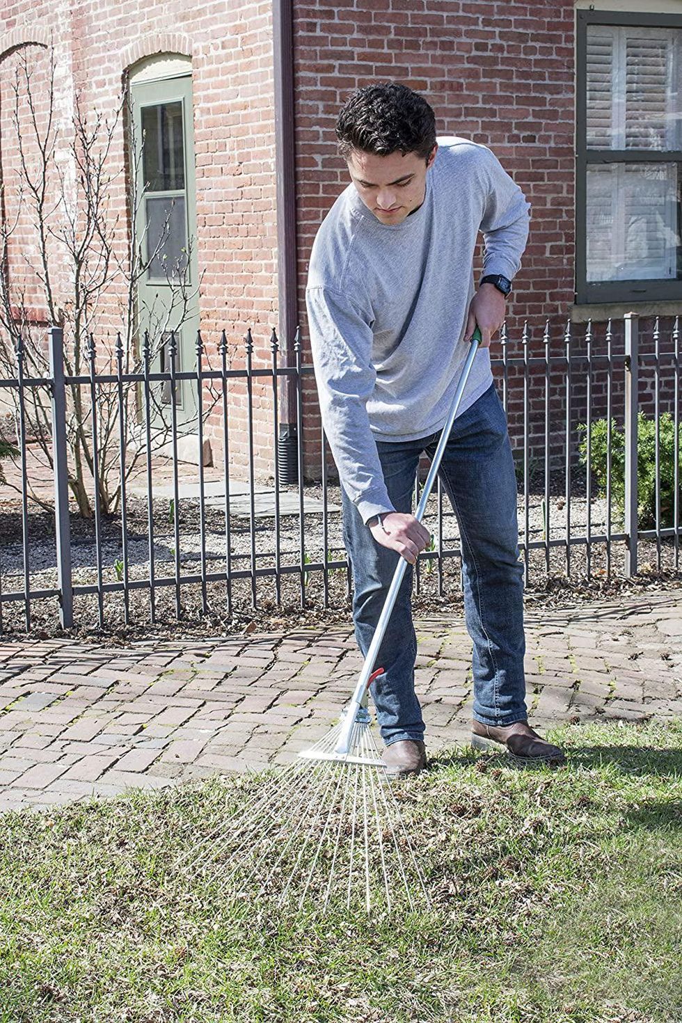 Perfect for fitting into tight spaces, this Telescoping Rake has a handle that adjusts from 37 to 68 inches long and tough steel tines that adjust from 7.5 inches to over 21 inches wide. It works great under hedges and in flower beds.