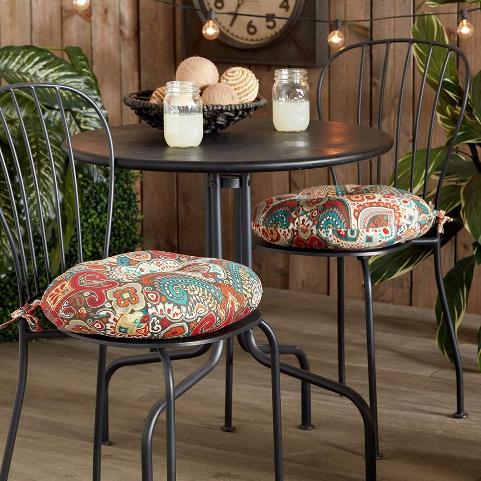 The easiest way to change up the look of your outdoor furniture — whether periodically or seasonally — is with the addition of chairs cushions like this pair for a bistro set. These round seat cushions are UV, water, stain, and fade-resistant and feature a warm palette of colors perfect for autumn. String ties keep the cushions firmly attached to your chairs.