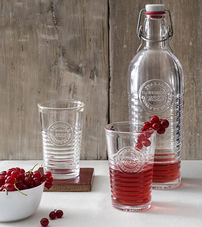 This Italian beverage set comes with a 40.5 oz swing-top bottle and four, 10.5-ounce tumblers each with a rolled rim for easy drinking. All pieces are made with stunning, thick glass that is easy to clean and dishwasher safe.