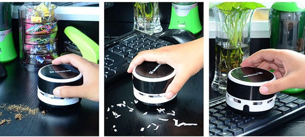 This might be the teeny-tiniest vacuum cleaner you’ve ever seen. A portable cordless sweeper/duster, this little guy fits in the palm of your hand and cleans crumbs, dirt, eraser residue and other debris. I recently purchased one to help with dust clean-up post- at-home manicures and it works like a dream. This one is powered by two AA batteries so there’s nothing to remember to charge either.