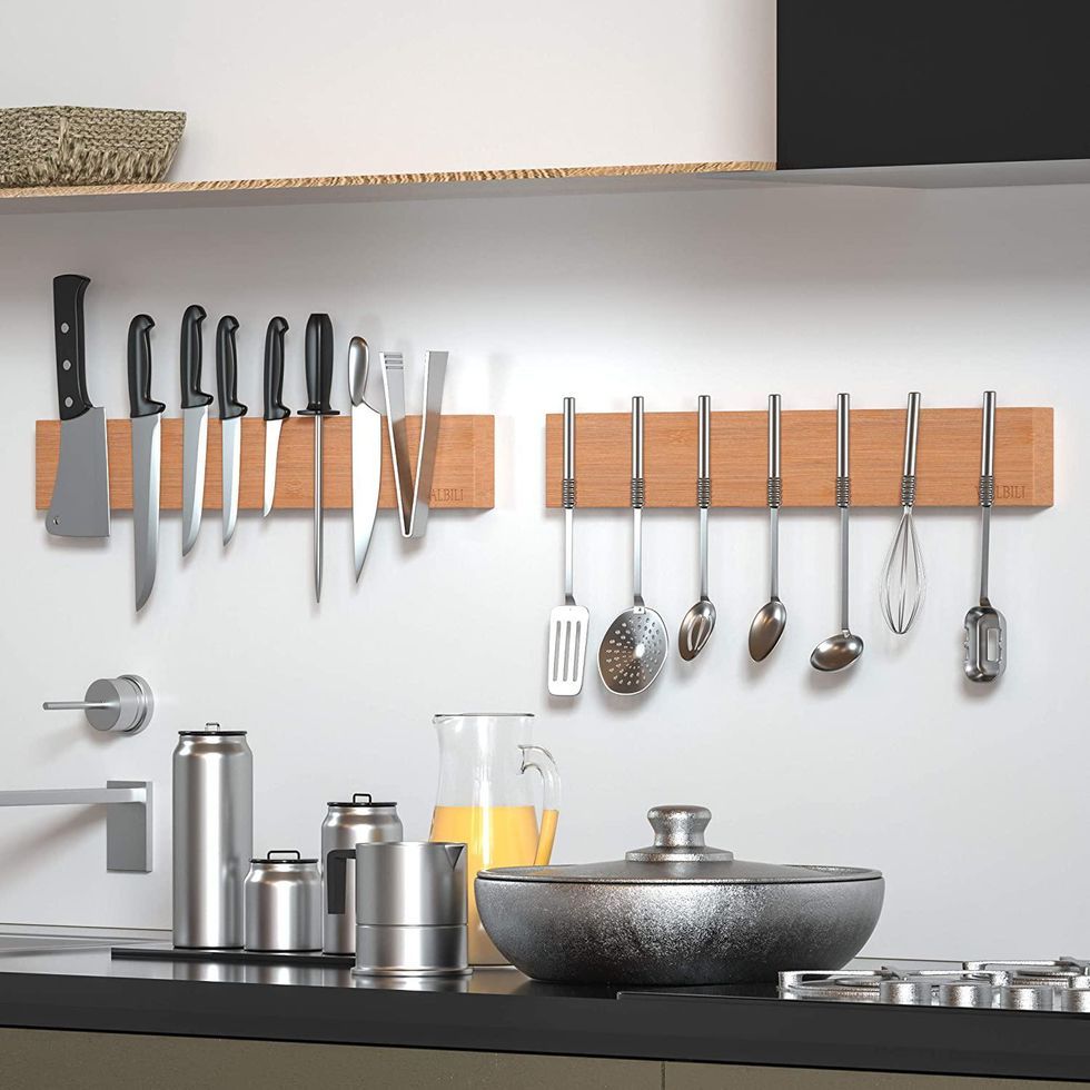 Whether you have run-of-the-mill knives or a more high-end choice, nothing looks cooler than displaying them using magnetic knife strips. These come in a two-pack, are made from bamboo, and reliably support knives and other utensils of all shapes and sizes. Buy it in black walnut or natural (pictured) and don’t worry about magnet strength; multiple reviews rave about its capabilities.