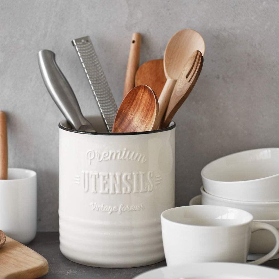 Kitchen utensils are like bunnies. First, you have one. Then, you have a second. Then, you have a million and don’t know where they all came from. This find won’t solve that problem (might I suggest a quick run to Goodwill?), but it will at least get the ones you do have under control. This one is a good size (translation: it’ll hold a lot) and comes in both white and gray.