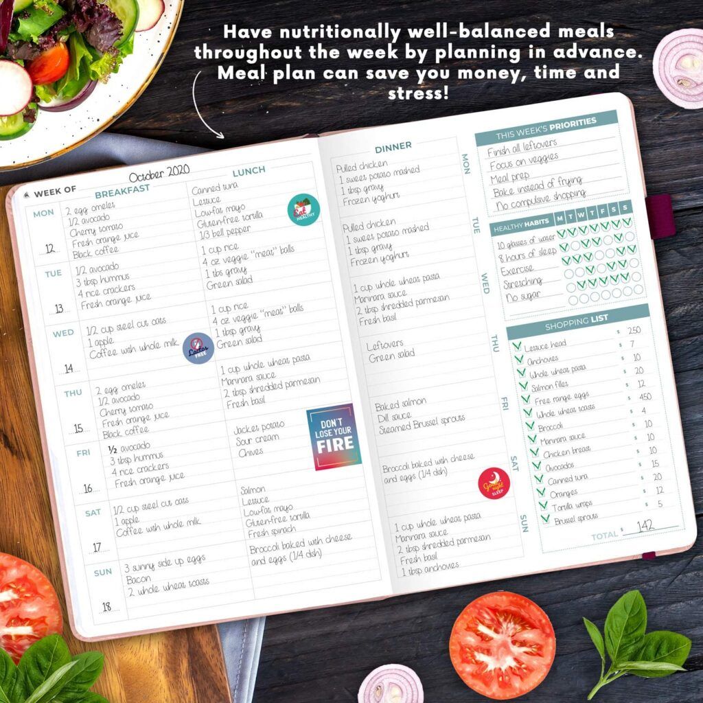 Meal planning is one of the easiest ways to maintain a healthy diet. Stay on track with your food goals with this meal planner. It lets you set diet goals, create a meal plan, track your habits, and compile grocery lists.