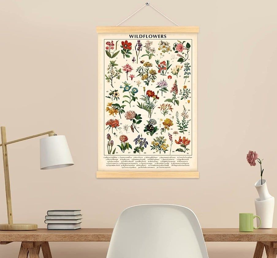 I just adore this rustic, floral poster with vintage illustrations of wildflowers and their names. It feels like a truly vintage touch that warms any room and provides a delicate, feminine air. The rustic wall hanging makes it super easy to put up so you can decorate your wall with a statement piece in just minutes.