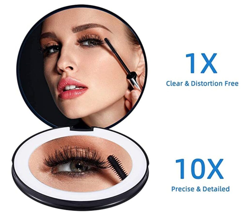 The Glocusent compact makeup mirror features an LED light that can magnify your face up to ten times an ordinary mirror. It also has three lighting settings to help you achieve the perfect look. This is the only compact you will want in your clutch.