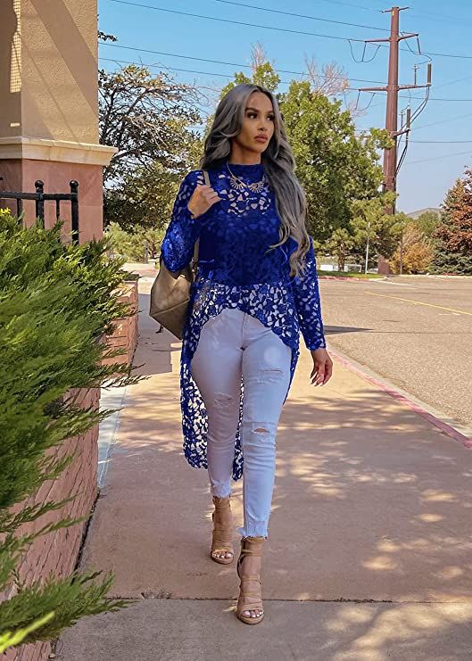 I’m going to leave you with lace because it’s wedding season and lace is always in fashion. This top features a high-low design, long sleeves, and a crew neck in a delicious all-over lace style. It has a near-perfect five-star rating on Amazon, pairs well with leggings, slim dress pants, or jeans, and is guaranteed to help you make your own entrance wherever you are.