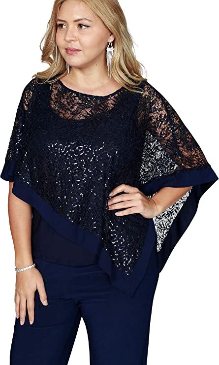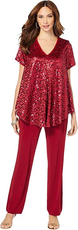Just because it’s not your wedding doesn’t mean you can’t shine, too. This plus-size sequin top and coordinating pants set is “comfort meets glam” in a dressed-up, single-color design. Available in sizes up to 44, you can choose from traditional black, navy, and silver as well as red, purple, and teal. The version pictured above would be great for Christmas parties as well.