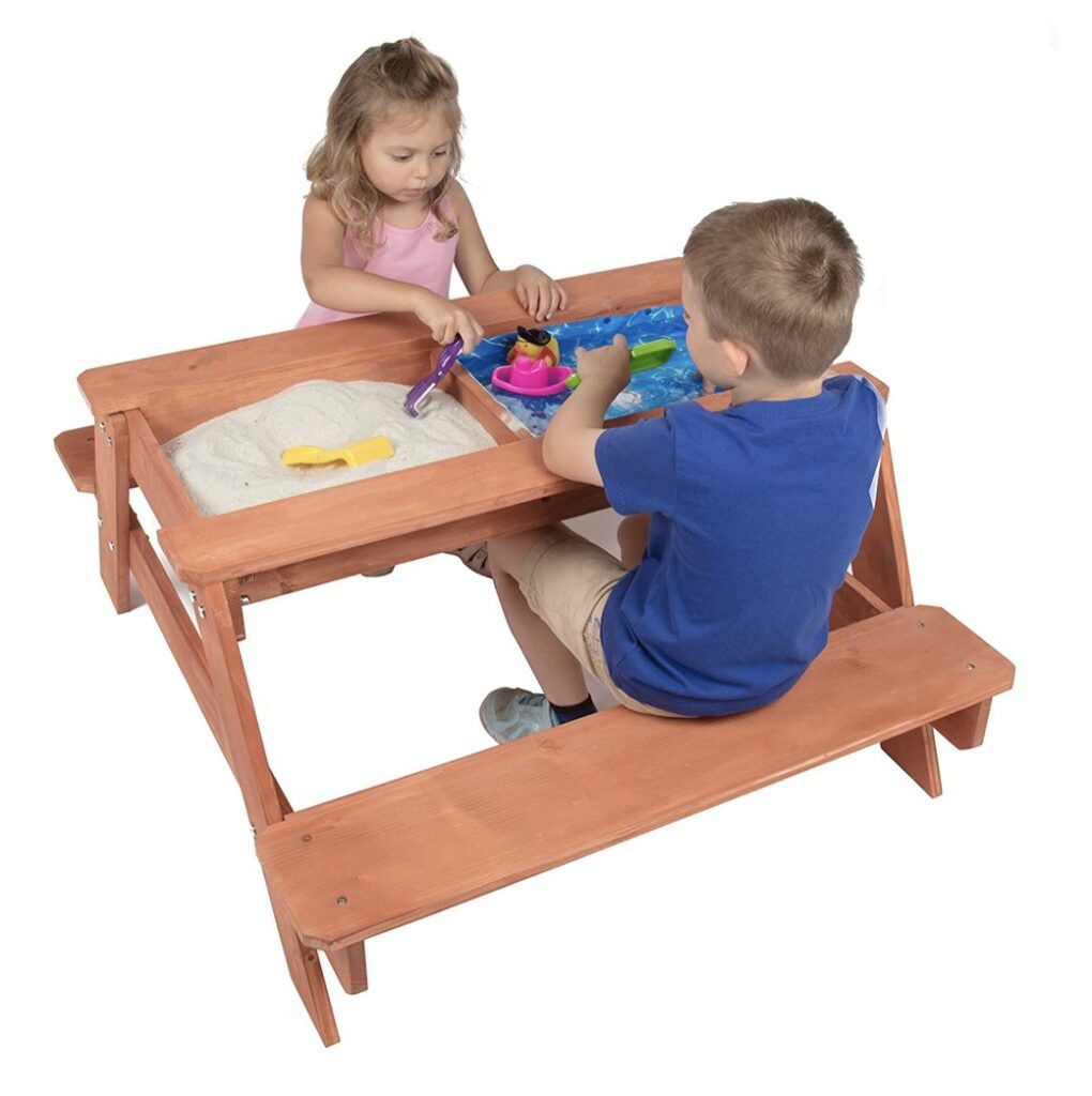 If you are limited on outdoor space, then you have to check out this kid’s picnic table. It has a handy removable panel that lets you convert it from a regular old picnic table to a sand and water play area.